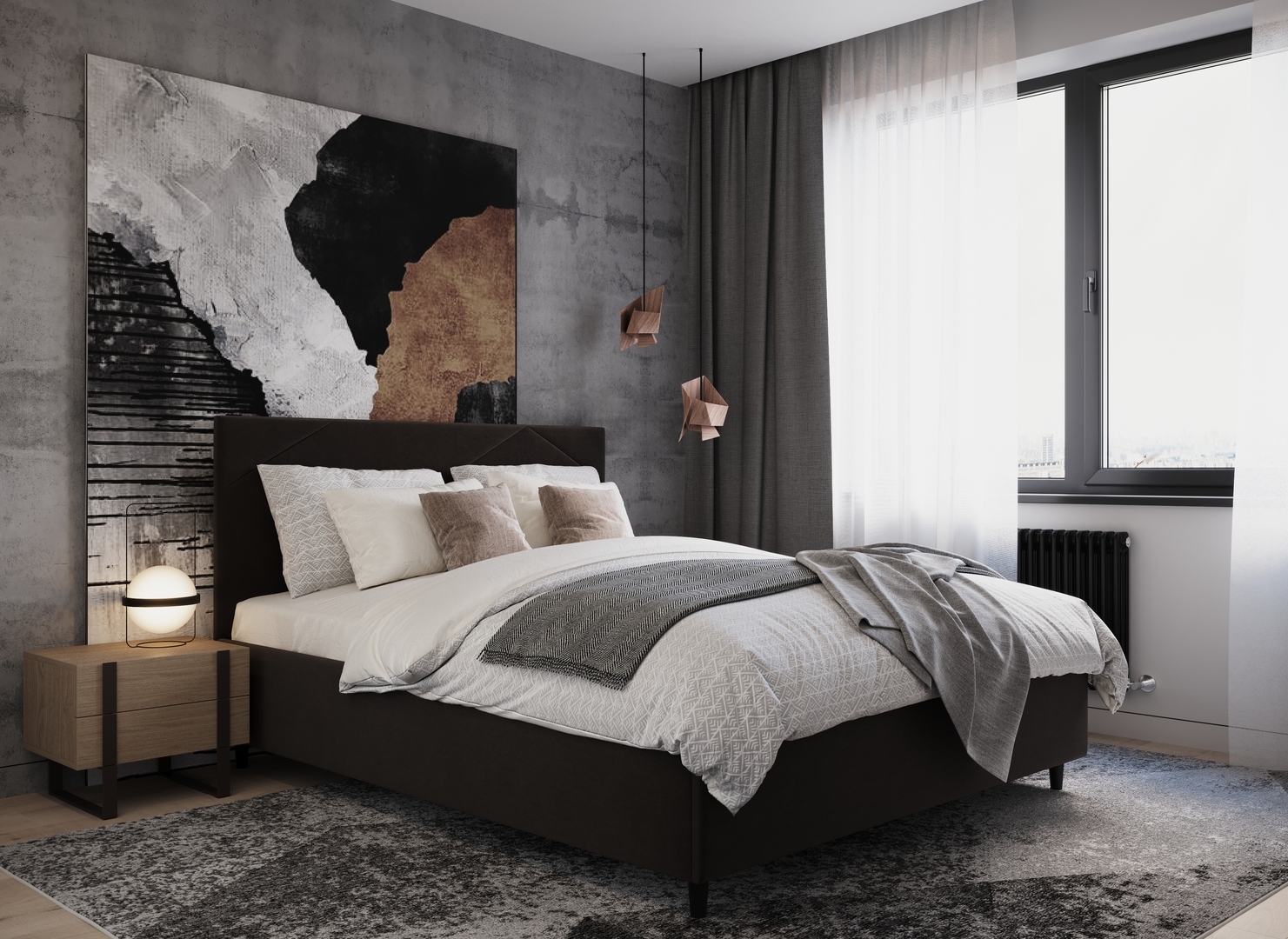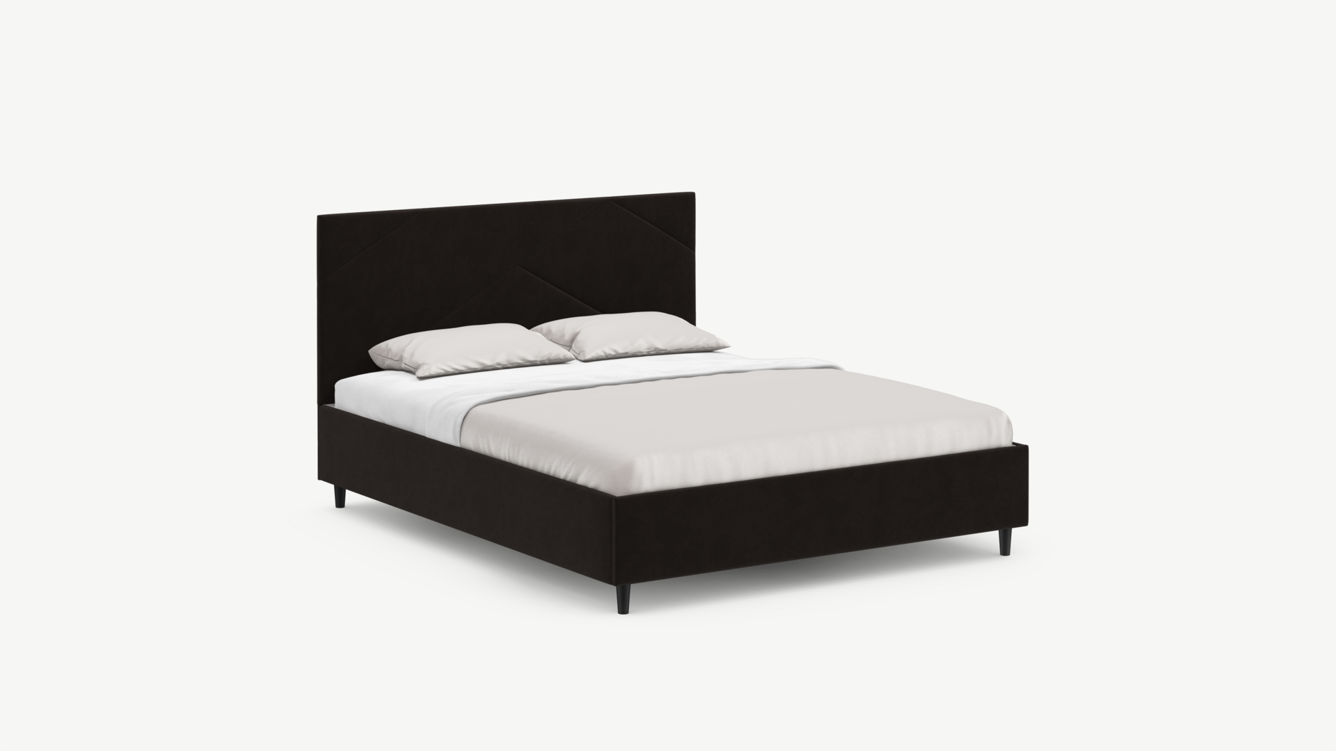 Элегантным и практичным акцентом служат скрытые карманы, расположенные по его углам. Лаконичные формы объемных царг создают единый гармоничный образ и фокусируют внимание на центральном текстурном элементе кровати.