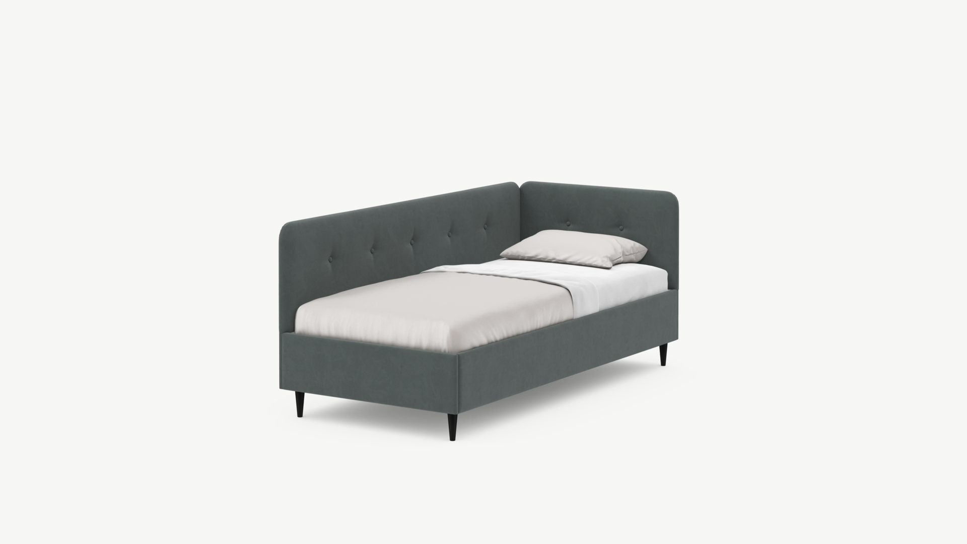 Угловая односпальная кровать MOON FAMILY 1253 с мягкой спинкой и изголовьем обладает округлыми формами, привносящими в интерьер нотки нежности. Изголовье, украшенное пуговицами, добавляет окружающему пространству шарм и уют. Высокие опоры придают кровати визуальной легкости, а также обеспечивают удобство во время уборки.